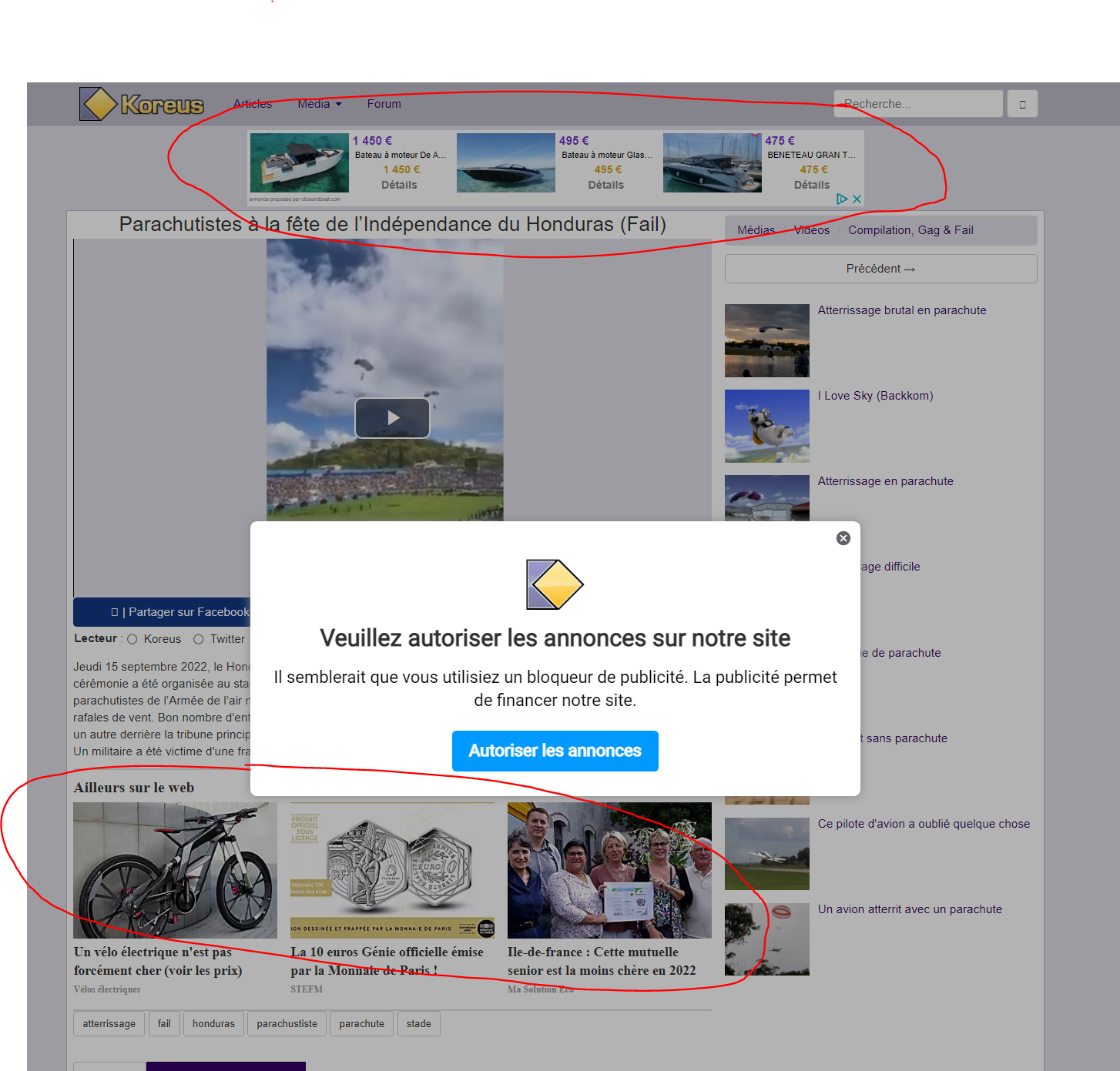 je viens de faire un test avec activation ublock origin (un bloqueur que je trouve bien mieux que adblock) > aucun message ni pub un autre test avec activation de ublock origin et ghostery > toujours aucun message ni pub je conseille la désinstallation de ad block (gestion des ad-ons désinstaller Ad-block ) pour se tourner vers ublock origin Pour chrome/brave/vivaldi : https://chrome.google.com/webstore/detail/ublock-origin/cjpalhdlnbpafiamejdnhcphjbkeiagm?hl=fr Pour Edge : https://microsoftedge.microsoft.com/addons/detail/ublock-origin/odfafepnkmbhccpbejgmiehpchacaeak?hl=fr-CA Pour Firefox : https://addons.mozilla.org/fr/firefox/addon/ublock-origin/ Pour Opera : https://addons.opera.com/fr/extensions/details/ublock/ La documentation pour le configurer et mettre à jour les bases de blocages : https://www.malekal.com/ublock-bloquer-publicites-internet/ Bon après n'oubliez pas que la pub paye l'hébergement du site. Perso il est désactivé sur Koreus.com, et je ne suis pas noyé par les pubs