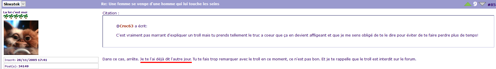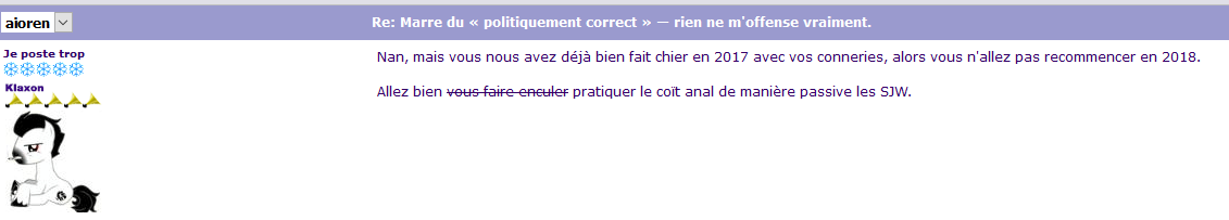 Ah ça n'a pas déjà été évoqué sur les topics concernés ? Ni les quelques posts au dessus du tien ? Je vais pas m'amuser à sortir des screenshots de leurs contexte mais je vais pointer ce qui m'agace. En ce qui me concerne, j'ai subi plusieurs choses. Le troll de Croc, qui a été remarqué au moins deux fois (j'irai pas chercher toutes les autres provocs que j'ai remarqué) ![]() Il reste impuni parce qu'il n'a pas dit "gauchiasse" ni "racelar". J'imagine qu'il ne me reste plus qu'à aller "bien me faire enculer" (ces mots me sont destinés) ![]() Citation : J'avais oublié, si vous voulez faire avancer les choses, je suis prêt à en discuter ici. Et pas sur le Discord. https://www.koreus.com/modules/newbb/topic160924-880.html#forumpost2523714 On est déjà quelques un·e·s à attendre des réponses...