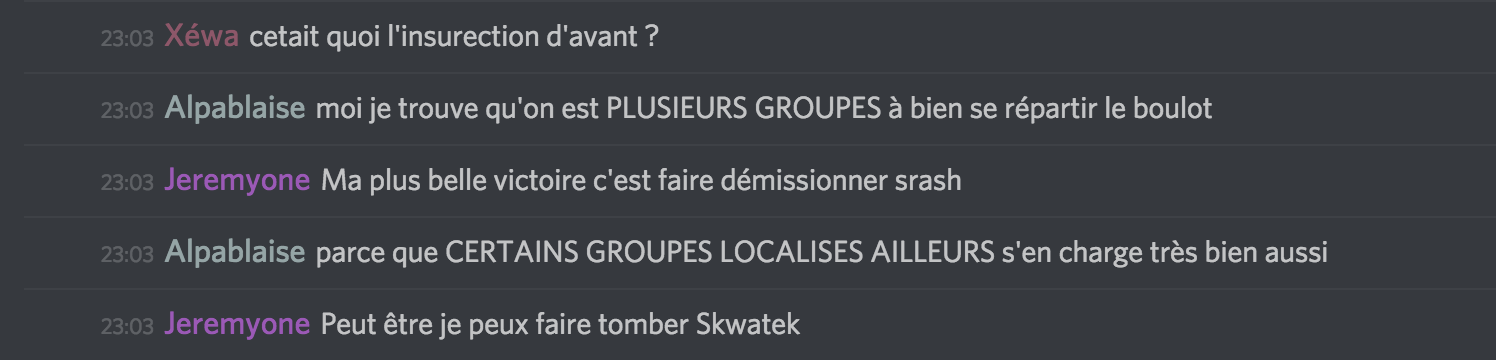 @Zertyy salut le tigre, je pense qu'il y a malentendu, tu as screen deux conversation qui se tenaient en même temps. Moi je faisais référence à un groupe de membre ayant décidé récemment d'enterrer les topics houleux dans la CDL en commentant les autres topics à côté, ou de contrebalancer un topic comme celui des violences à Nouvel An avec un topic sur l'Amour dans les Cités. C'est plutôt pacifique comme façon de faire.