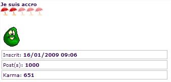 ![]() et félicitations pour tes 9000 que j'ai aperçu ce matin dans le fofo jeux j'en croyais pas mes yeux ^^ mais ça claque !