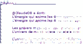 Citation : Humains et esprits ont une communauté de sort. Ils sont compatibles. Ils sont programmés pour vivre en symbiose. Elle est la seule et unique liaison entre les univers matériel et métamatériel. Sans elle, pas de transfert d'énergie possible, pas de symbiose des univers, pas d'univers. Certains en manquent pas mal en ce moment, non ? ![]()