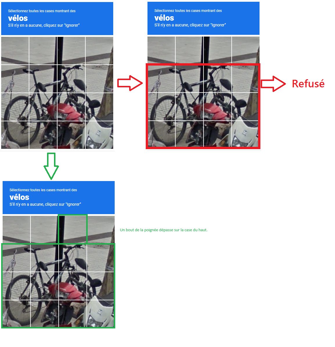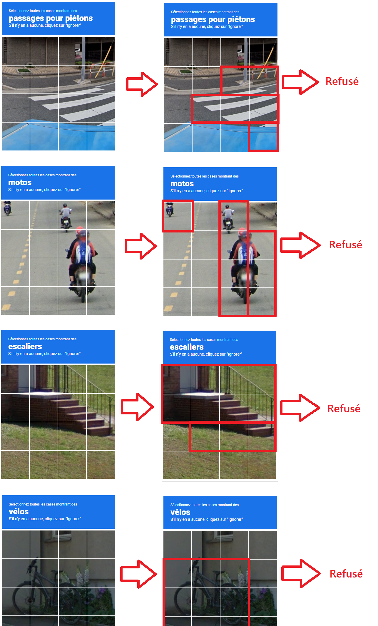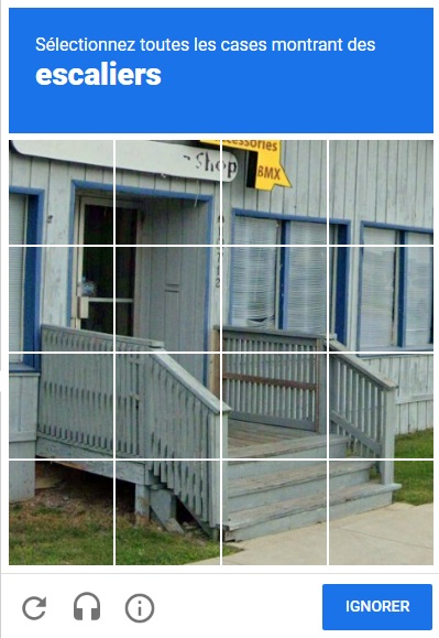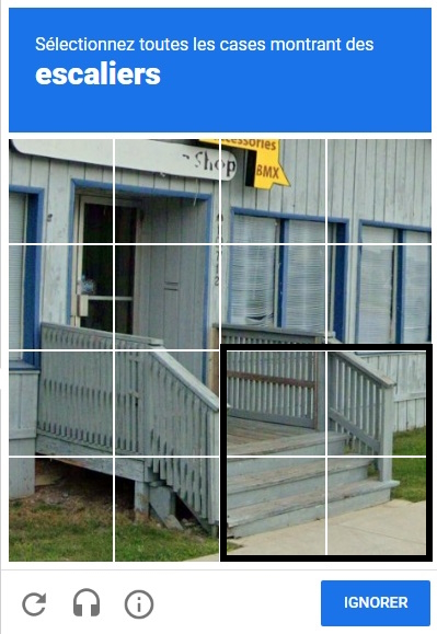 Je n'y arrive avec rien ! La plupart du temps les cases contiennent un bout de l'escalier ou du feu ou du vélo mais pas l'objet en entier, je ne sais donc pas si je dois cliquer sur certaines cases ou non. Et je ne sais pas le nombre de cases que le CAPTCHA attend de moi. Tant de dilemmes ! Dans l'exemple de l'escalier, vous auriez sélectionné lesquelles ? Toutes sauf les 4 premières ?