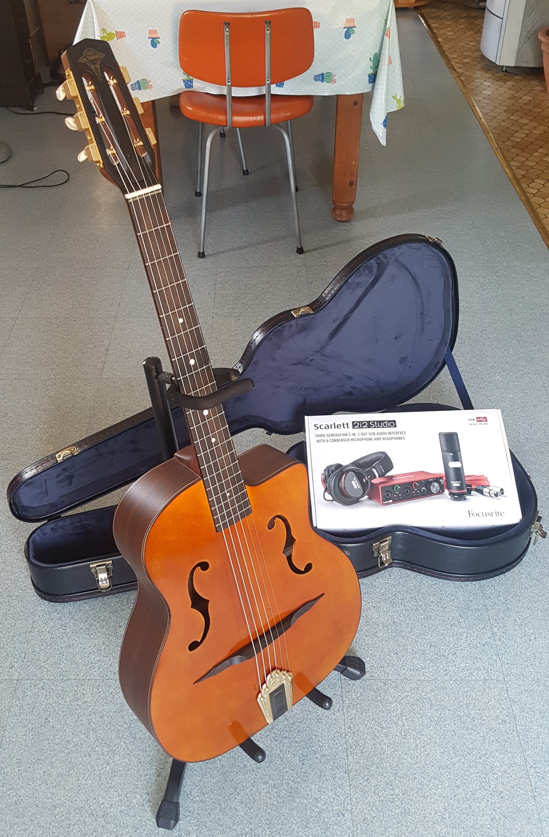 ça y est enfin ! Je reviens de chez Dupont Metzner, et pas les mains vides mes amis ! J'ai enfin ma petite dernière qui sonne du feu de Dieu : Une Altamira MF 01 Antique style Selmer Maccaferri avec son étui s'il vous plaît ! Et enfin du matos pour s'enregistrer un poil plus convenablement avec une interface Scarlett 2i2 troisième génération de chez Focusrite ![]() Jipépééééééééééé !!!