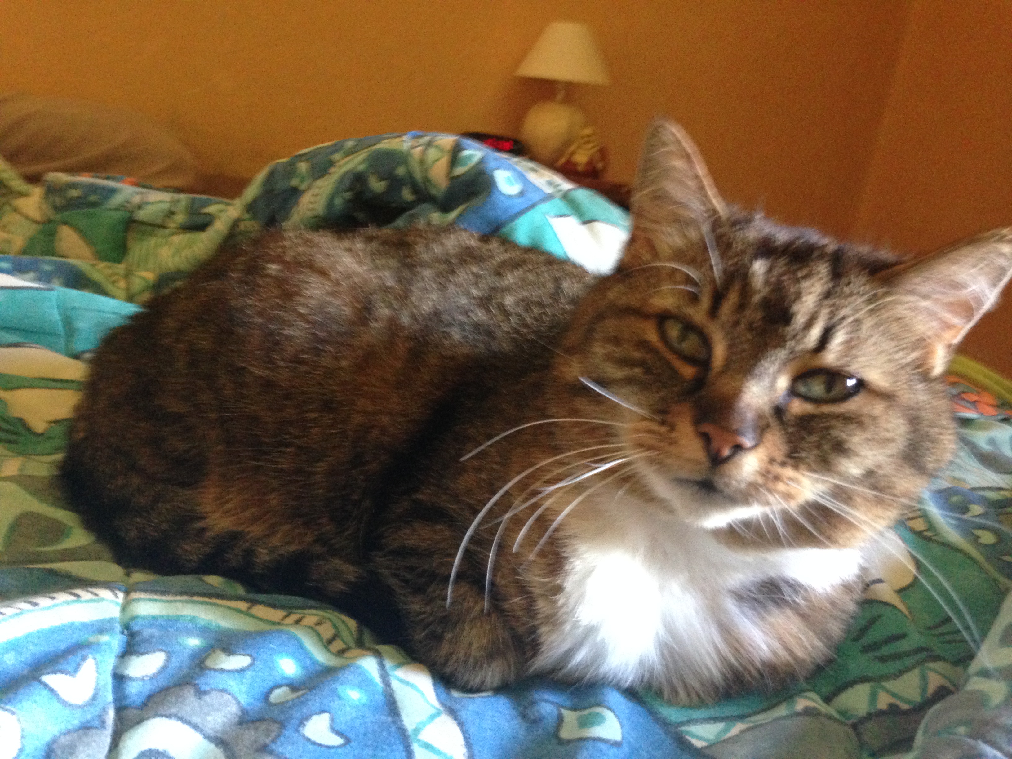Ma Pépite qui est posée au plumard, après l'extraction de sa maudite collerette.
