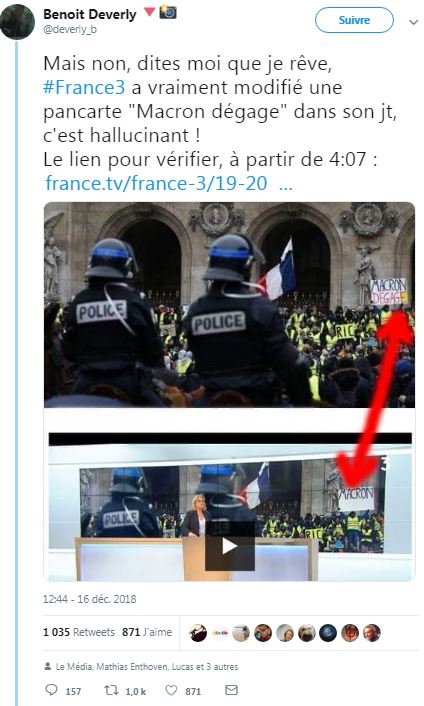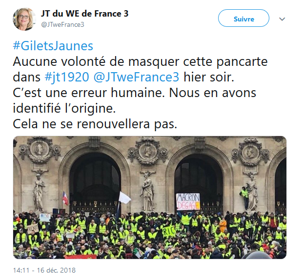 Le JT de France 3 diffuse un reportage sur la manif Gilets Jaunes. Un énième reportage sur le sujet donc En image de fond ils ont utilisé une image certainement "esthétique". Mais ils avaient pris soin de supprimer le "dégage" sur une pancarte "Macron dégage" France 3 plaide "l'erreur humaine" qui "ne se renouvellera pas" ![]() A 4:07 sur le replay france.tv Via lexpress.fr
