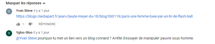 Bien résumé @Croc63 J'ai vu qu'il protégeait une femme car sur FB les jaunes on publié dans ce sens, j'ai donc regardé les vidéos et je me suis fait mon propre avis, donc tu mens par ignorance en disant que j'ai utilisé un argument donné après pour être méchant. Je soutiens la violence contre la violence du gouvernement, le type s'est frayé un chemin sur un pont face à ses ennemis comme un véritable guerrier Français face aux anglais, sans même parler politique ce mec n'en est pas la moitié d'un. Les gendarmes mobile ont eu 8 fois le choix de ne pas réprimer dans le sang les jaunes, ils ont même eu l'occasion de se plaindre du gouvernement mais Alliance, qui est un syndicat qui avait appelé à voter macron leur a dit de rester dans le rang. Tout les gendarmes, policers, crs qui vont livrer bataille le samedi, le font en leurs âmes et consciences, ils sont de plus en plus violent car il goûtent à l'impunité et aiment ça, cela devient leur exutoire. Pour la femme morte, à laquelle tu tiens tant: surprise, il y a des rumeurs sur les réseaux sociaux et vu que les médias mainstream ne sont plus fiable ça amplifie l'effet. Je t'ai répondu au bout de quelques heures que les réseaux d'informations des gilets jaunes avaient démenti l'info mais tu as continué d'en parler.
