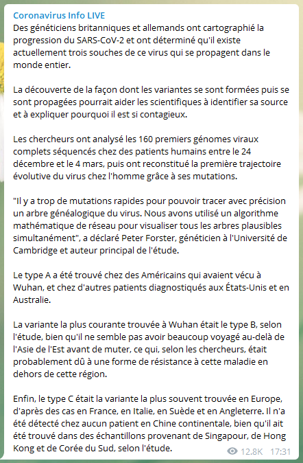| Je suis accro    Inscrit: 23/05/2009 12:20 Post(s): 545 Karma: 100 | Pas de complot mais j'ai trouver ça intéressant https://trustmyscience.com/pandemie-fictive-coronavirus-simulee-octobre-2019-a-tue-65-millions-personnes/