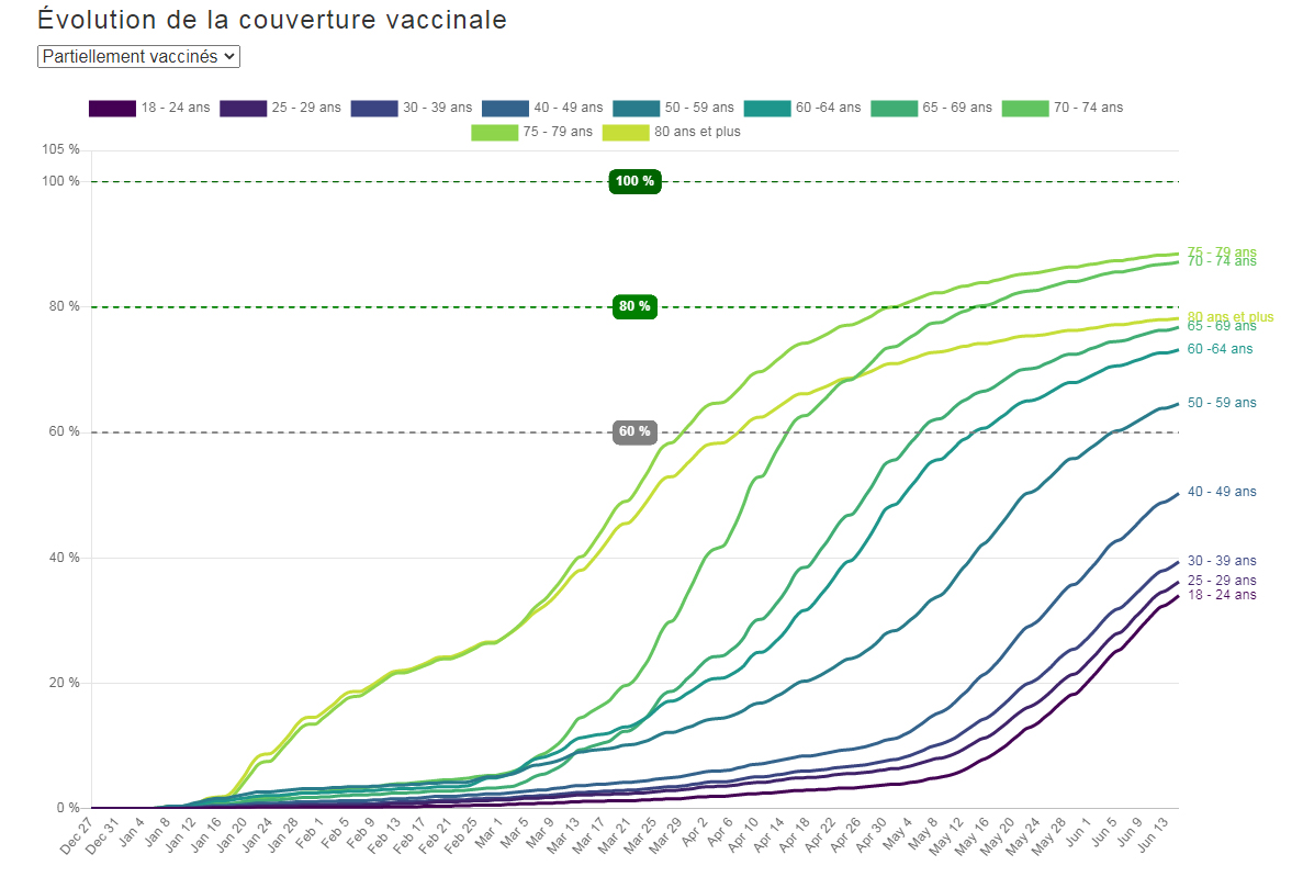 ![]() Sur les personnes âgées on le voit clairement. Or, ce sont elles qui sont les plus vulnérables. D'autre part, la courbe s'infléchie beaucoup plus tôt que prévue sur les 50/59 ans. La couverture nécessaire était de 60% pour la souche initiale et est montée jusqu'à 90% de la population totale minimum à cause des variants initiaux. Sachant que le variant indien (delta) est plus contagieux et plus résistant, ce nombre sera forcément supérieur (peut-être 93/94% minimum) et qu'aujourd'hui aucune catégorie n'a atteint ces 90%...
