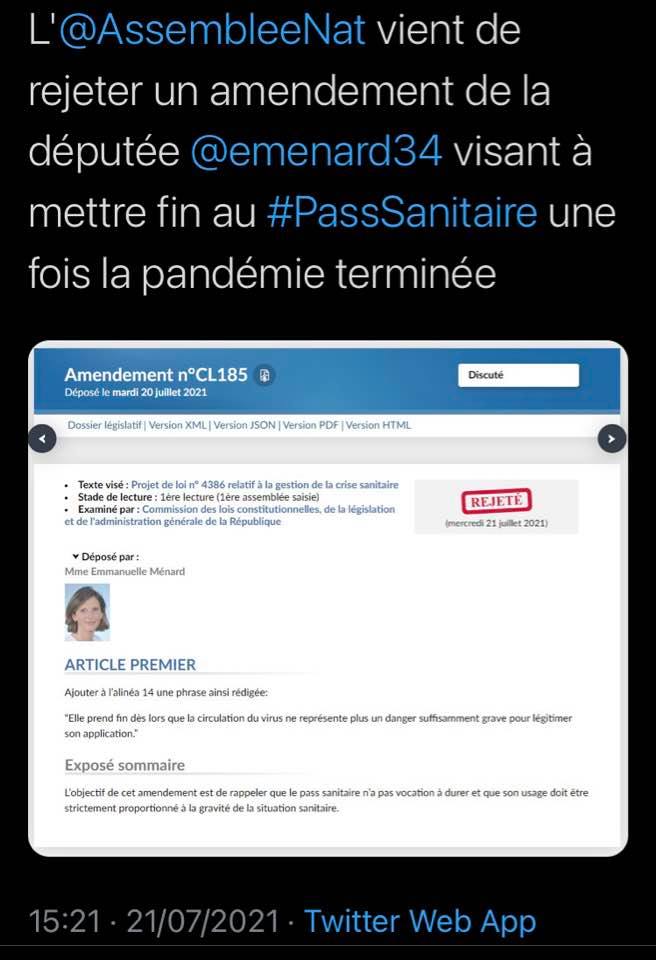 Mea Culpa si l'amendement n'a pas été encore rejeté mais il le sera comme tout ceux non soumis par LREM. Pour info : ![]() Alors que Véran lui même ce soir a dit plus de passe sanitaire dès que 100% de vaccinés mais il n'y aura jamais 100% de vaccinés. On sera indéfiniment dans un état d'urgence, d'abord terroriste puis désormais sanitaire.