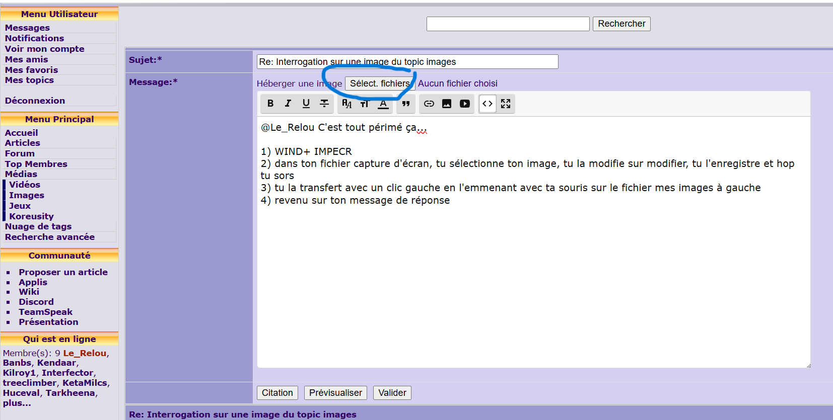 1) WIND+ IMPECR 2) dans ton fichier capture d'écran, tu sélectionne ton image, tu la modifie sur modifier, tu l'enregistre et hop tu sors 3) tu la transfert avec un clic gauche en l'emmenant avec ta souris sur le fichier mes images à gauche 4) revenu sur ton message de réponse, tu clic : ![]() 5) tu sélectionne ton image et tu l'ouvre 6) fini ![]() Mais il y a encore plus rapide mais je me souviens plus, j'ai cette routine en tête alors je continue ![]()