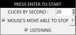 Un autoclicker qui peut servir dans vos jeux incrémentales... Fait maison ! (Compatible sur Windows seulement) ![]() On peut souligner le soin apporté aux graphismes ! Mode d'emploi : - Téléchargez - Ouvrez l'archive zip - Cliquez sur install.bat - Sélectionnez la fréquence de clique par seconde (1 à 1000 ( enfin 1000 ... en théorie - Pour lancer le logiciel : Appuyer sur Entrée - Pour stopper les clics automatiques : Appuyer sur Echap - Pour fermer le logiciel : Appuyer une seconde fois sur Echap - Pour faire varier le nombre de clics à la seconde : Scroller la roulette de votre souris - La première coche "MOUSE'S MOVE ABLE TO STOP" sert à déterminer si les mouvements de la souris arrêtent les clics automatiques - La seconde coche "LISTENING" sert à déterminer si le logiciel doit attendre une commande (Entrée, Escape, Roulette, ...). Elle doit donc être cochée pour pouvoir lancer le logiciel avec la touche Entrée. Avertissement : Ca clique tout seul, donc ne soyez pas débile et n'allez pas faire un tour sur vos comptes bancaires en ligne pendant que le logiciel est en marche... (C'est un exemple ! Hein !?) Téléchargement : Version python : Lien (github) Version exécutable : Lien (archive zip) PS : Je suis ouvert aux critiques constructives (notamment de ceux, ici, qui s'y connaissent bien mieux que moi) PS 2 : Pas sûr d'être dans la bonne section, ni sur le bon forum non plus d'ailleurs... ^^