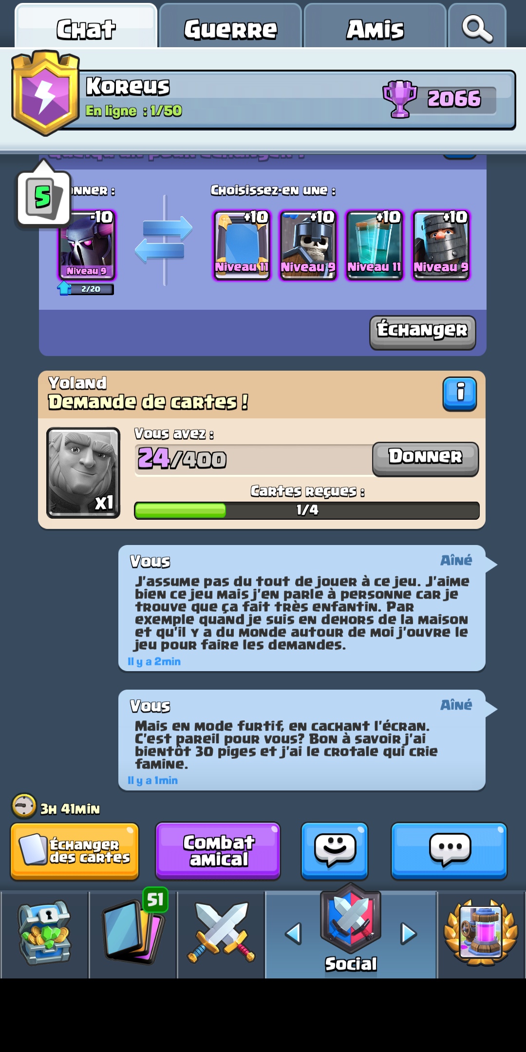 Du coup voici la charte, que je mettrai dans les messages du clan petit à petit. C'est très court ^^ Présence : Tous les 3 mois d'inactivité -> rétrogradé d'un rang. Si 'membre', c'est le kick. Bien entendu, si la personne décide d'être à nouveau active, elle pourra revenir dans le clan. En cas exceptionnel (gros stage dans la nature profonde de plus de 3 mois, emploi du temps dingue,...) juste prévenir avant et on fera une exception. J'essaierai de poke ici les membres inactifs qui ont un compte Koreus, mais je ne connais pas tous les pseudos, je ferai du mieux que je peux. Activité : Participations aux guerres non obligatoire, faites comme bon vous semble ! Par contre, si vous commencez à faire ne serait-ce qu'un combat de préparation, obligation de faire les autres et le combat de guerre final. C'est tout ou rien, si vous décidez de participer, faites le jusqu'au bout. Un oubli est envisageable, mais n'abusez pas, surtout si vous avez déjà été remis à l'ordre. Don : Non obligatoire. A partir du moment où personne ne se plaint de ne pas recevoir les cardes qu'il demande, je pars du principe qu'on a de la marge à ce niveau, ainsi, si vous ne voulez pas donner de carte, rien ne vous y oblige. Autres : Pas d'insultes, de dénigrement, de moqueries sur quoi que ce soit, mais bon, ça vous savez, vous êtes tous bien éduqués si vous êtes sur Koreus