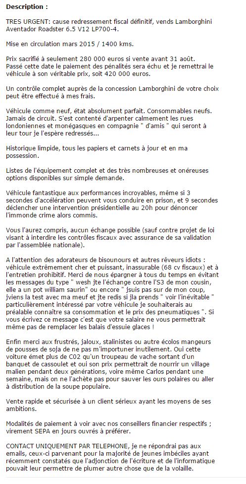 Aucun propriétaire de lamborghini ne possède pareil humour voyons .. Bravo .