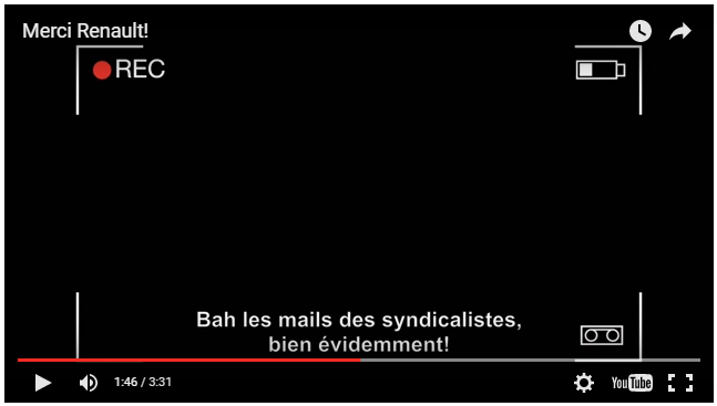 Je vous laisse découvrir la vidéo par vous même. Mais en gros le type risque le licenciement parce que les boîtes mails des syndicalistes de chez Renault sont surveillées et qu'il leur a recommandé le film "Merci Patron" qu'il avait vu la veille en se disant que ça pouvait leur plaire... Étrange