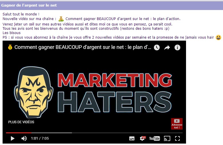 Nouvelle vidéo sur ma chaîne : Comment gagner BEAUCOUP d'argent sur le net : le plan d'action.Venez jeter un œil sur mes autres vidéos aussi et dites moi ce que vous en pensez, ça serait cool. Tous les avis sont les bienvenus du moment qu'ils sont constructifs (restons des bons haters :p) Les bisous PS : si vous vous abonnez à la chaîne je vous offre 2 nouvelles vidéos par semaine et la promesse de ne jamais vous haïr ![]()