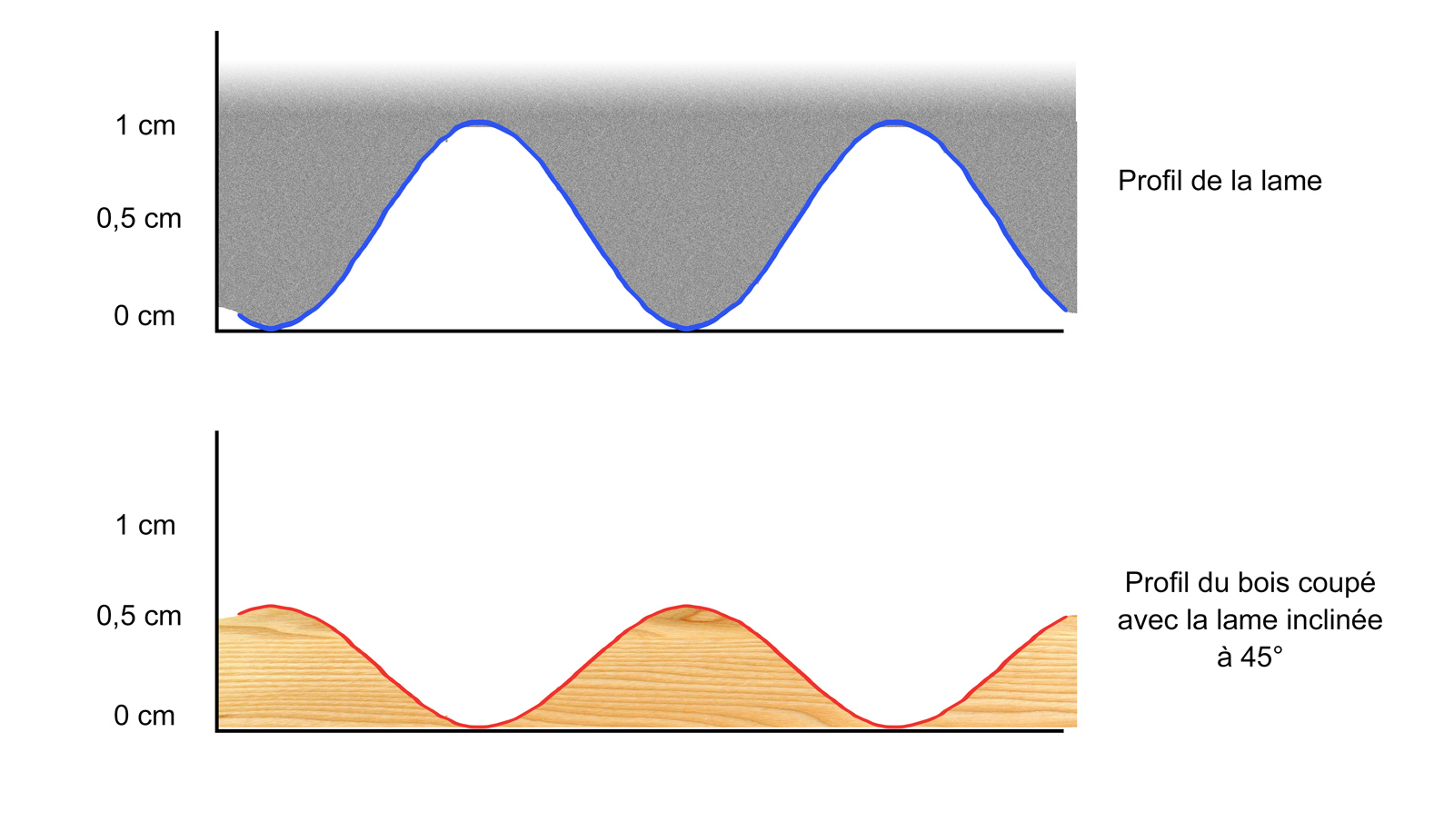 Elle ne peut pas être droite pour faire cette forme. Logiquement, avec un angle à 45°, les courbes de la lame doivent être deux fois plus importantes que celle qu'on voit ensuite dans le bois.