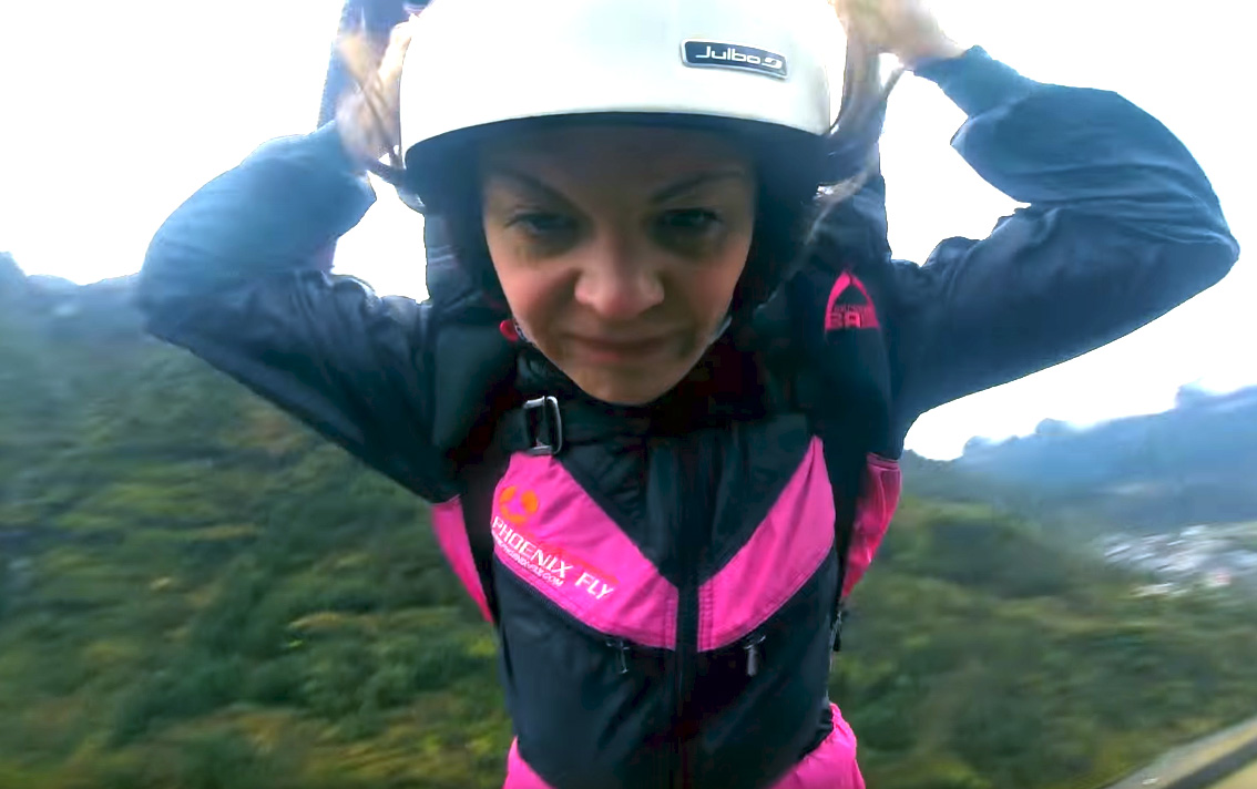 La BASE jumpeuse russe Otmashka Dubinina réalise un saut, avec le sourire, depuis le pont Aizhai situé près de Jishou, en Chine, malgré le désaccord des policiers.