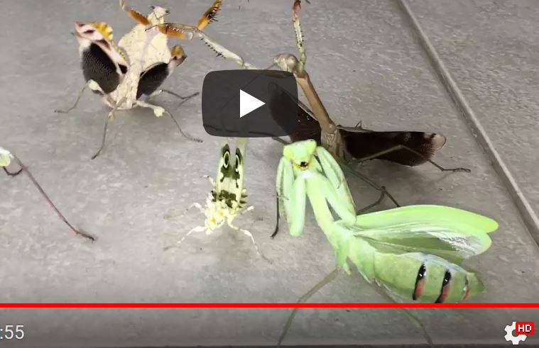 Plusieurs mantes religieuses de différentes familles sont immobiles avec les pattes avant en l'air pour montrer qu'elles sont prêtes à passer à l'attaque !