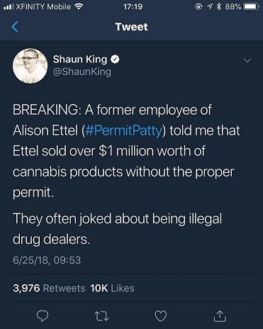 Elle est responsable d'un centre qui vend du canabis apparement. Un de ses anciens employé aurait déclaré qu'elle n'a pas toujours eu les permis necessaires pour en vendre (à verifier).