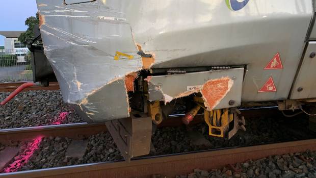 Car hit by train at Bruce McLaren Rd La semaine dernière, la société Auckland Transport a publié sur Twitter une vidéo filmée par une caméra embarquée à l'avant d'un train. Alors que le train était lancé à pleine allure, deux voitures ont forcé un passage à niveau et ce malgré les signaux d'avertissements. La seconde voiture a même été légèrement touchée, mais le conducteur a pu repartir pour prendre la fuite. Les dégâts (minimes) sur l'avant du train : ![]() (sources stuff.co.nz & Auckland Transport)