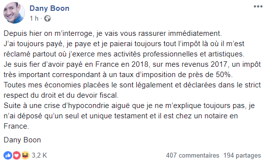Mais j'ai pas remarqué que Dany Boon faisait particulièrement ca (là en compactant plusieurs interview peut eter espacées, ca donne cette impression, mais peut etre biaisé) Je pense que n'importe qui en France qui serait un peu riche ferait comme tout le monde "Ah y a moyen de payer moins d'impot, bah allons y cool" EDIT : Ha ha rapide le Dany Boon pour faire interdire la vidéo