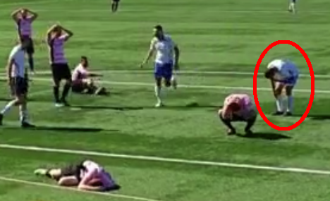 Hilarious moment defender blasts penalty rebound into own net contre camp fail