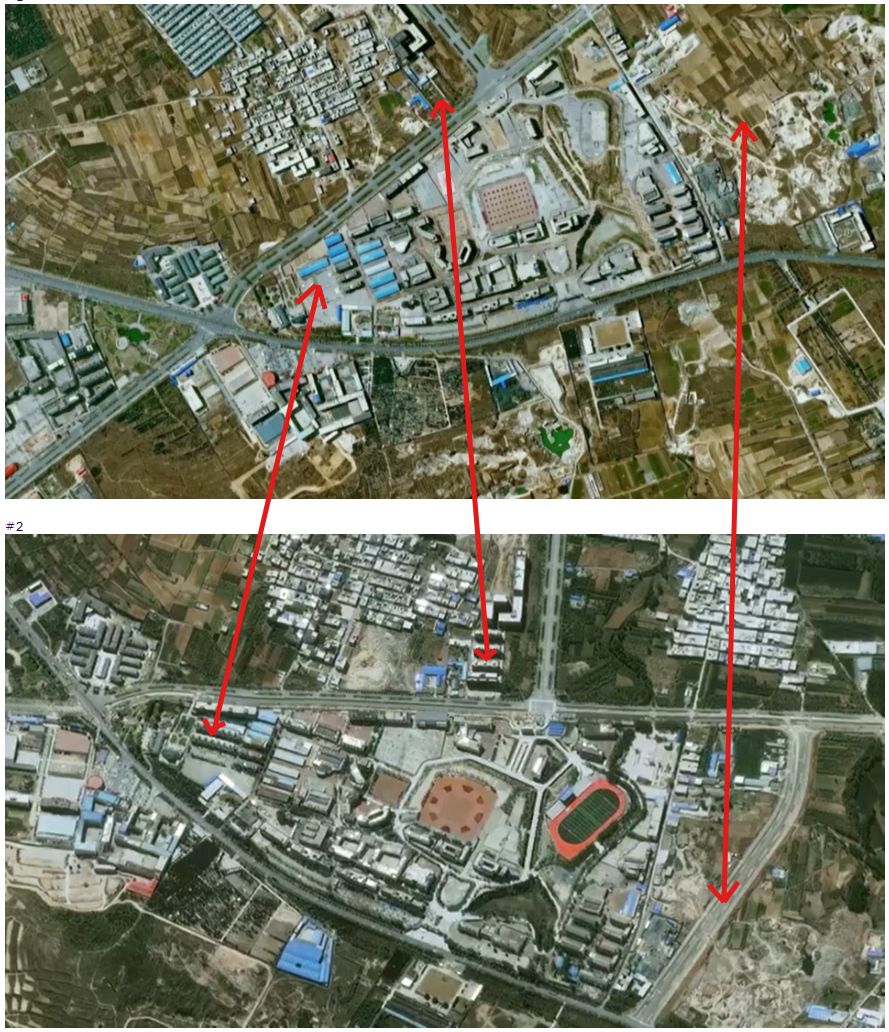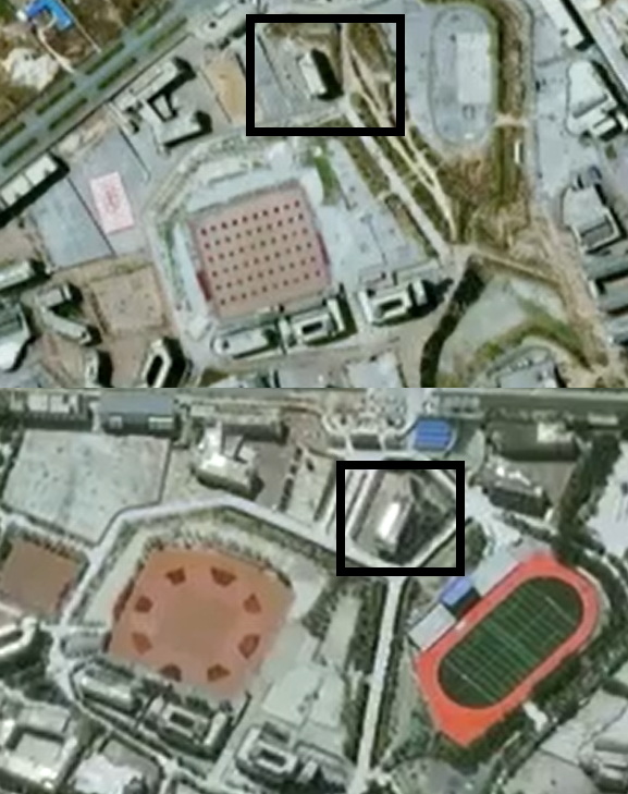 A ma connaissance, la vidéo par satellite ça ne se fait pas. Peut être certains satellites secrets d'espionnages en sont capable, mais c'est loin d'être sur tellement c'est mal pratique et plus simple et moins couteux avec des Drones furtifs. Un satellite d'observation (donc plutôt à basse altitude) doit aller très vite pour rester en orbite (plus une orbite est basse, plus elle doit être rapide). L'ISS a ~400 km d'altitude doit aller à une vitesse de ~27 000 Km/h pour conserver son orbite. Plus on est près, moins on a besoin de caméra puissante (objectif puissant surtout) mais plus on va vite et moins le champ de vision peut être grand et la durée d'observation sera courte (normal on va plus vite). En admettant que l'on filme depuis l'espace, il est impossible d'avoir un plan fixe. Le résultat sera forcément un survol avec changement de point de vue et même plutôt rapide ... Voici les 3 seules photos prisent de l'espace présentent dans le clip sur le site de la BBC #1 ![]() #2 ![]() #3 ![]() Notez bien le très grand changement de l'angle de vue bien visible sur les bâtiments entre les photos #1 et #2 : ![]() On peut d'ailleurs douter de l'histoire expliquée sur le site, puisque qu'entre les clichés 1 et 2 ils ont eu le temps de finir la construction d'un stade avec une belle piste d'athlétisme ... Je suis prêt à l'affirmer avec une certitude de 99.729 % : Rien n'a été filmé de l'espace, juste des prises de photos. Et au vu des écarts de dates entre les clichés, je doute aussi de l'entièreté de l'histoire de prise de rendez vous pour faire le show spécialement à la bonne heure pour être sur les clichés. J'imagine bien plus simplement qu'ils ont remarqué que l'on voyait ces entrainements sur certains cliché satellites et qu'ils sont aller les filmer après coup, pour raconter une belle histoire et faire d'impressionnantes images de Drones. Les satellites qui filment depuis l'espace, ce n'est qu'au cinéma. P.S. Pourquoi 99.729 % ? Parce que moi aussi, j'aime bien romancer les histoires que je raconte.