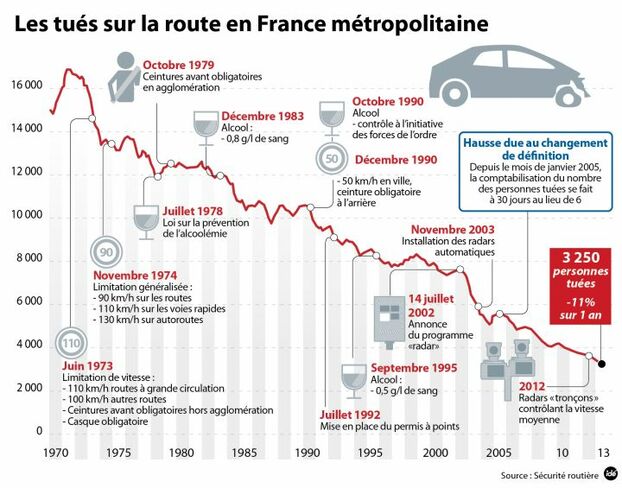 On retrouve cette baisse notable sur le graphique de @vivaberthaga. A noter que la baisse intervient bien avant juin 1972 et les limitations des vitesses. Et ne pas oublier que le nombre total des morts n'est pas un indicateur pertinent sans faire le ratio avec le nombre total de kilomètres parcourus (la courbe verte sur mon schéma). Ce ratio "morts/km" n'a jamais cessé de baisser. Entre les mesures règlementaires et les améliorations des voitures (tenue de route, résistance aux crash, meilleurs équipements...) et des routes (autoroutes, signalisation, rond-points...), qu'est ce qui a le plus contribué ?