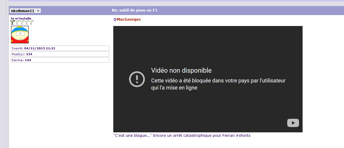 Ca me sidère toujours les mecs outrés d'un truc qui ne pige que de loin. Ha, c'est clair que ça prête à sourire et que ça mérite 2-3 phrases, surtout quand y'a un passif pas ouf de l'écurie pendant le championnat, on peut poser des questions rhétoriques, tout ça, mais ouais, foncer droit dans le pseudo-drama pour faire du content, please... "Han la la quoi, les gros nullos là, j'aurai tellement fait mieux, les pneus y sont rangé là, par 4, c'pas difficile quoi !"