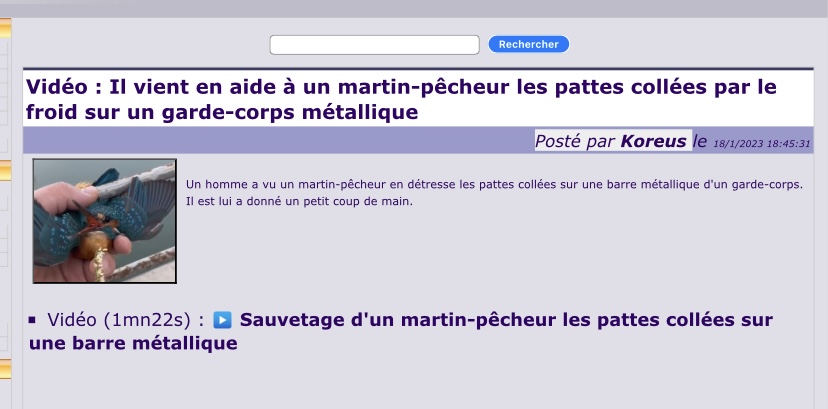 | Kilroy1 | Libérer un martin pêcheur avec les pattes gelées sur une rambarde |