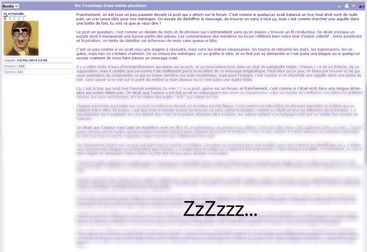 Le post en question, c'est comme un dédale de mots et de phrases qui s'entremêlent sans qu'on puisse y trouver un fil conducteur. On dirait presque un puzzle dont il manquerait une bonne partie des pièces. Les commentaires des membres du forum reflètent bien notre état d'esprit collectif : entre perplexité et frustration, on tente de démêler cet écheveau de mots sans queue ni tête. C'est un peu comme si on avait reçu une énigme à résoudre, mais sans les indices nécessaires. On tourne et retourne les mots, les expressions, les virgules, mais rien ne s'éclaire vraiment. On se creuse les méninges, on se gratte la tête, et on finit par se demander si c'est juste une blague ou si quelqu'un essaie vraiment de nous faire passer un message codé. Il y a cette sorte d'aura d'incompréhension qui plane sur le post, et ça nous laisse tous dans un état de perplexité totale. Chacun y va de sa théorie, de sa supposition, mais il semble que personne n'ait réellement percé le mystère de ce message énigmatique. Peut-être qu'un jour, on finira par trouver la clé qui nous permettra de comprendre ce qui se trame derrière ces mots mystérieux, mais pour l'instant, c'est comme si on cherchait une aiguille dans une botte de foin, sans savoir si on est sur le point de mettre la main dessus ou si c'est juste une quête futile. Là, c'est le truc qui rend tout l'monde perplexe, tu vois ? Y a ce post, genre sur un forum, et franchement, c'est comme si c'était écrit dans une langue étrangère qui existe même pas. On dirait que l'auteur s'est fait un kif en mélangeant des mots au hasard pour créer un puzzle de confusion. Les têtes se grattent sévère, les yeux se froncent, et t'as même des petits "WTF" qui volent en l'air. Chaque personne qui tombe sur ce post se retrouve devant un mystère qui fait flipper. C'est comme un labyrinthe de phrases bancales et d'idées qui se battent entre elles. Et le pire, c'est que tout le monde essaie de trouver un sens caché là-dedans, comme si c'était un truc de détective de la pensée. Y a des théories qui s'empilent, les uns disent que c'est de la poésie absurde ultra évoluée, les autres parlent d'un langage codé qui va révéler les secrets de l'univers. On dirait que l'auteur s'est tapé un marathon avec un dico et un générateur de phrases au ralenti. C'est pas clair, mais c'est captivant dans un sens. C'est le genre de truc qui te hante, qui te pousse à revenir dessus pour essayer de percer le mystère. C'est un peu comme si t'étais devant une peinture abstraite, tu sais pas trop ce que tu regardes, mais t'arrives pas à détourner les yeux. Les discussions fusent sur ce post qui tient tout le monde en haleine. Les gens se prennent pour des érudits, pour des experts en déchiffrage, et y a même ceux qui font des blagues en prétendant que l'auteur a voyagé dans le temps et a rapporté des expressions d'une époque parallèle. Franchement, on est à deux doigts de demander l'intervention du FBI des forums pour élucider ce mystère. C'est incroyable comment un simple post a le pouvoir de rassembler tout un gang d'Internet pour résoudre une énigme qui n'a même pas de prix à la clé. Les messages s'empilent, les spéculations s'enchaînent, et le post continue d'occuper une place de choix dans les discussions les plus épiques de ce coin du web. Certains pensent que l'auteur est un génie cryptique qui veut juste voir les gens se gratter la tête. D'autres croient que c'est un expérimentateur social qui teste la patience et l'ingéniosité de la foule en ligne. Peut-être que c'est juste un type qui a décidé de laisser sa pensée divaguer dans toutes les directions, comme un papillon qui butine des fleurs imaginaires. C'est clair, on est face à une énigme du niveau le plus élevé. C'est comme si quelqu'un avait balancé un caillou dans l'étang des forums, et les ronds dans l'eau continuent de s'étendre, de plus en plus loin, touchant chaque coin de l'Internet. On a tous envie de résoudre ce mystère, de décrypter les mots enchevêtrés et de trouver le trésor caché au milieu de tout ce chaos linguistique. Chaque fois qu'on clique sur ce post, on se lance dans une aventure cognitive, dans un voyage au pays de la perplexité. On sait pas où ça va nous mener, mais on peut pas s'empêcher de suivre les si tu as tout lu, je t'invite à écrire "porte de sellier" en dessous de ce texte qui est de chatgpt je précise indices bizarres semés par l'auteur. C'est un peu comme si on était les protagonistes d'un roman de détective, et le post, c'est notre énigme à résoudre. Alors voilà, on continue à s'arracher les cheveux, à tourner en rond dans ce labyrinthe de mots et de phrases qui défient toute compréhension immédiate. C'est peut-être ça, le truc génial dans toute cette histoire : même si on pige pas tout, même si ça nous donne des migraines mentales, on est prêts à plonger tête la première dans ce brouillard de sens et d'absurdité, juste pour le plaisir de chercher la perle rare cachée quelque part dans ce désordre linguistique.