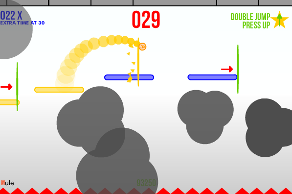 Faites en sorte que le compte à rebours ne se termine pas pour parcourir la plus grande distance avec votre smiley en contrôlant vos sauts 🙂