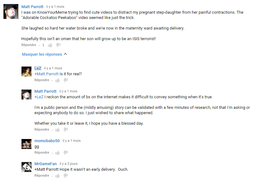 Damn, quelqu'un la poste tous les mois dis donc ^^ https://www.reddit.com/r/videos/comments/3fizca/adorable_cockatoo_plays_peekaboo/ C'est marrant, parce-que ce midi, j'en parlai avec mon frère, il connaissait la vidéo mais ne savait pas que j'étais derrière ce montage. Il l'avait vu passer sur 4chan. Elle a pas mal tourné sur Twitch également, des streamers trollaient leur viewers en diffusant la vidéo ![]() En tout cas, cette parodie m'aura rendu fier pour une chose: ![]() J'ai déclenché un accouchement grâce à ma connerie ![]()