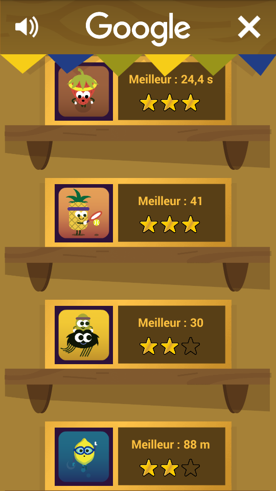 2016 Doodle Fruit Games - g.co/fruit Jusqu'au 21 août, l'application Google vous propose 7 mini-jeux gratuits sur votre smartphone: https://www.google.com/doodles/fruitgames Mes records perso: ![]() ![]()