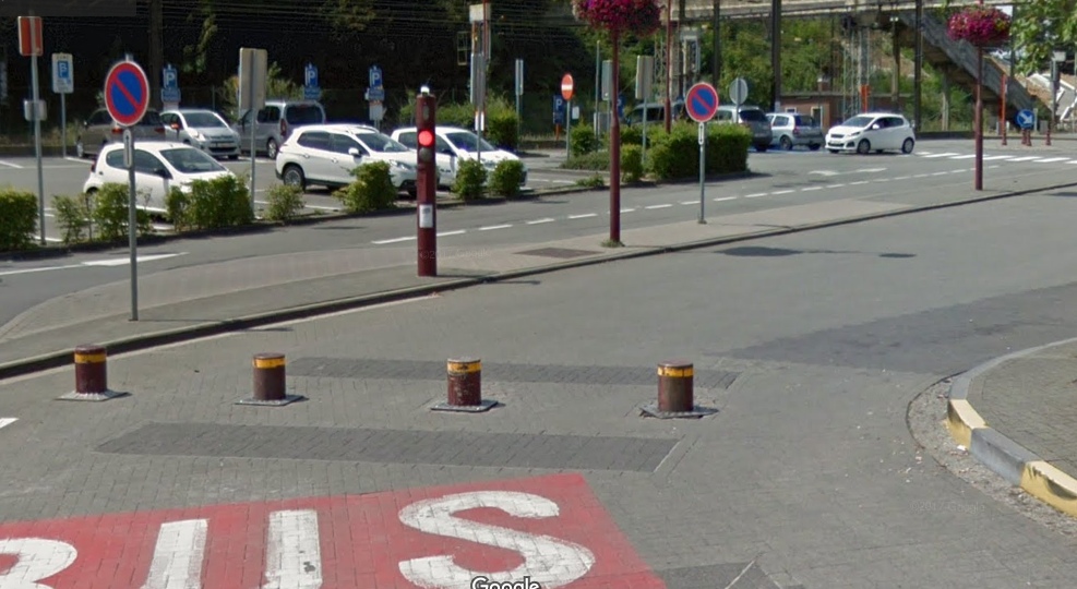 Alalala ces fameuses bites, toujours prêtes à attaquer ! Ca me rappelle un endroit près de chez moi où quand je rentrais de l'école, chaque jour je voyais une voiture accidentée ou une maintenance (l'un ou l'autre), je pense que les nombreuses réparations auront coûtées plus chères qu'une vraie barrière plus "avancée"... Les accidents sont causés par le fait que les bus ouvrent le passage et que des voitures suivent après, car elles confondent le passage du bus et l'allée parallèle destinée aux voitures... On voit les traces des derniers impacts sur cette capture d'écran :