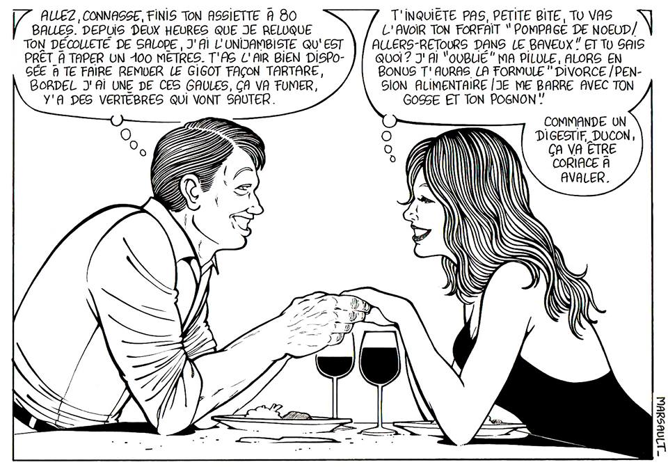 "Moi j'en ai marre des femmes. L'autre fois j'en ai vu une qui couinait pour ceci ou cela. Faut qu'elles s'éduquent entre elles" Je suis pas sûr que ça passerait