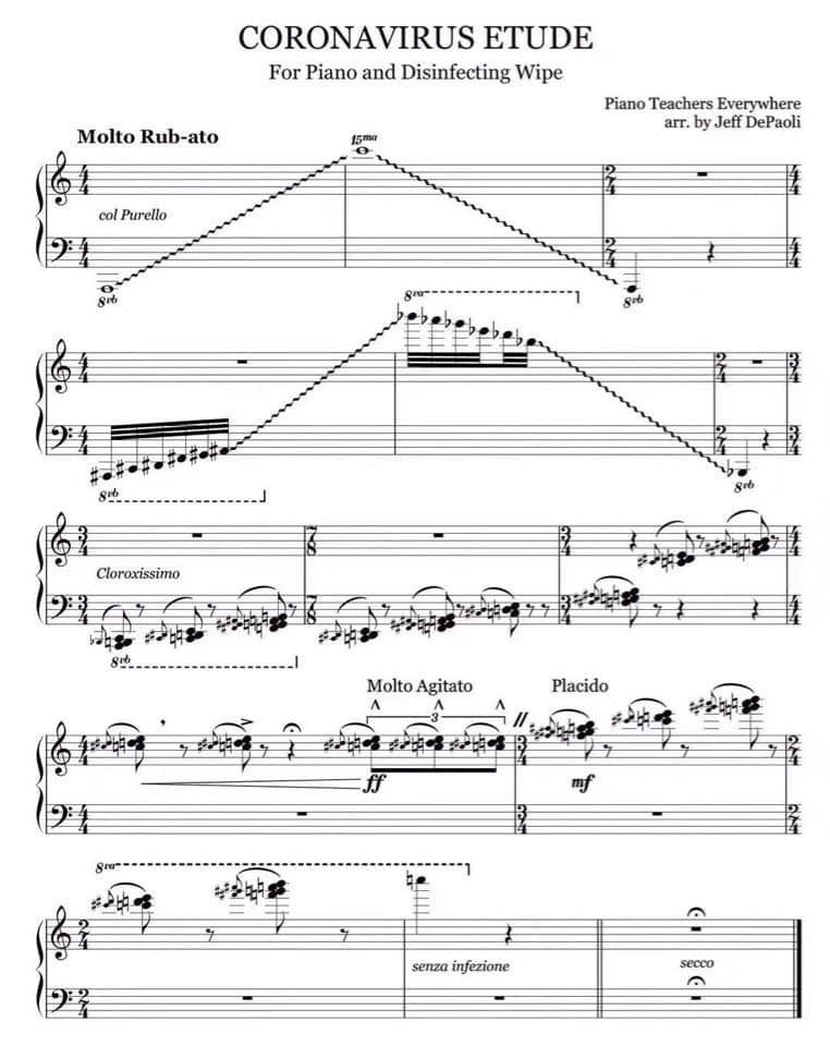 ![]() Coronavirus Etude pour piano et lingette désinfectante. Et ce que cela donne : Sek Thongsuwan, son compositeur, conseil au professeur de piano de jouer ce morceau après le passage de chaque élève.