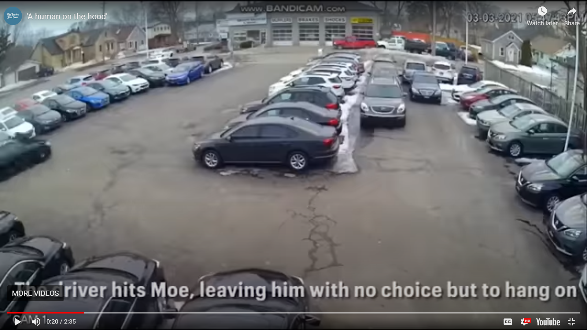 ![]() ![]() Tandis que Moe (le vendeur) attend debout devant le véhicule... ![]() Le conducteur renverse Moe, ne lui laissant d'autre choix que de s'accrocher [au capot]