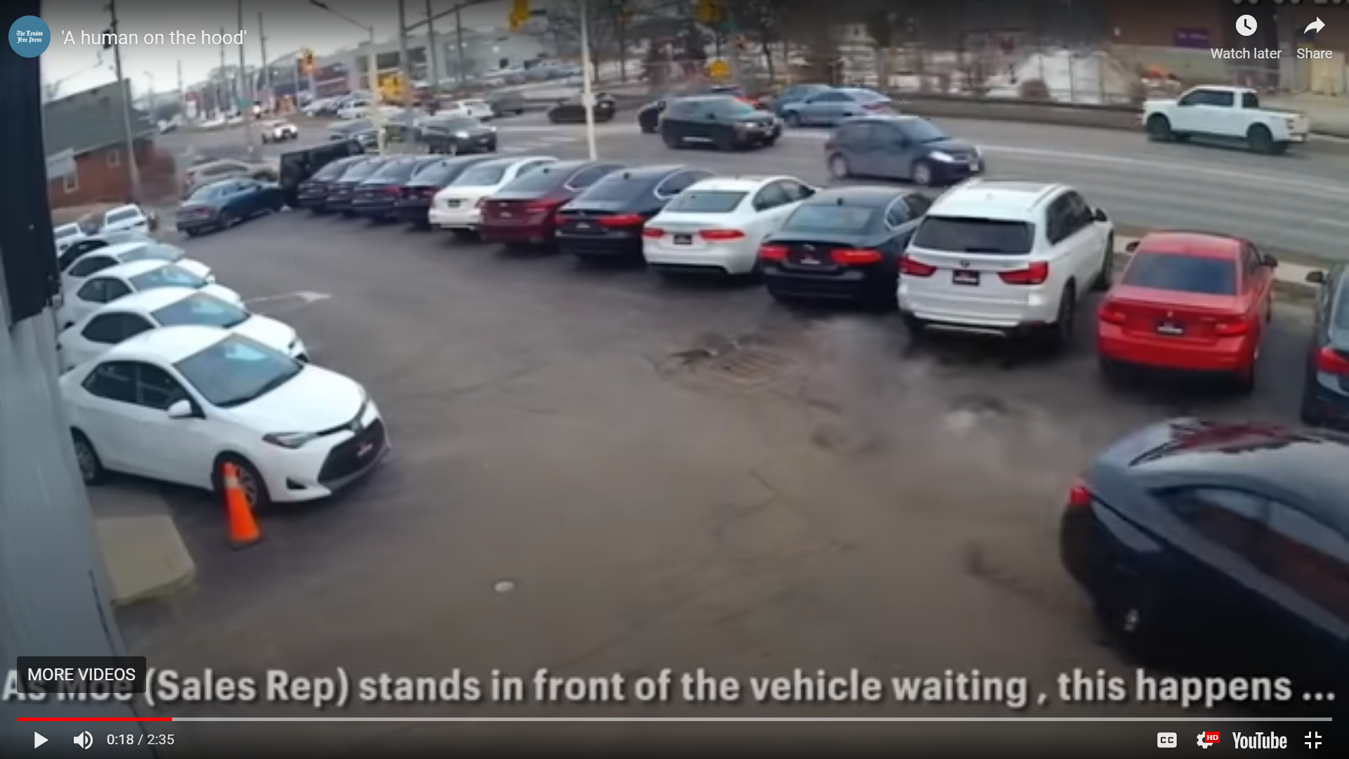 Un concessionnaire s'accroche au capot de sa voiture entrain d'être volée (Canada) :