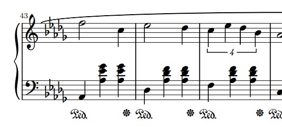 Un exemple de "4 pour 3", Chopin, valse minute, mesure 45 ![]() En vérité c'est un exercice de coordination pas si difficile quand on le décompose.
