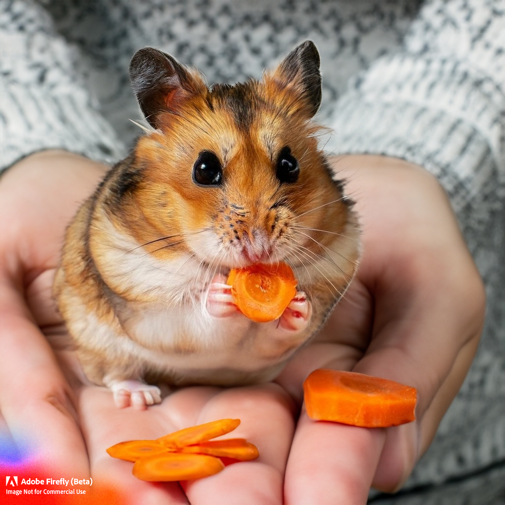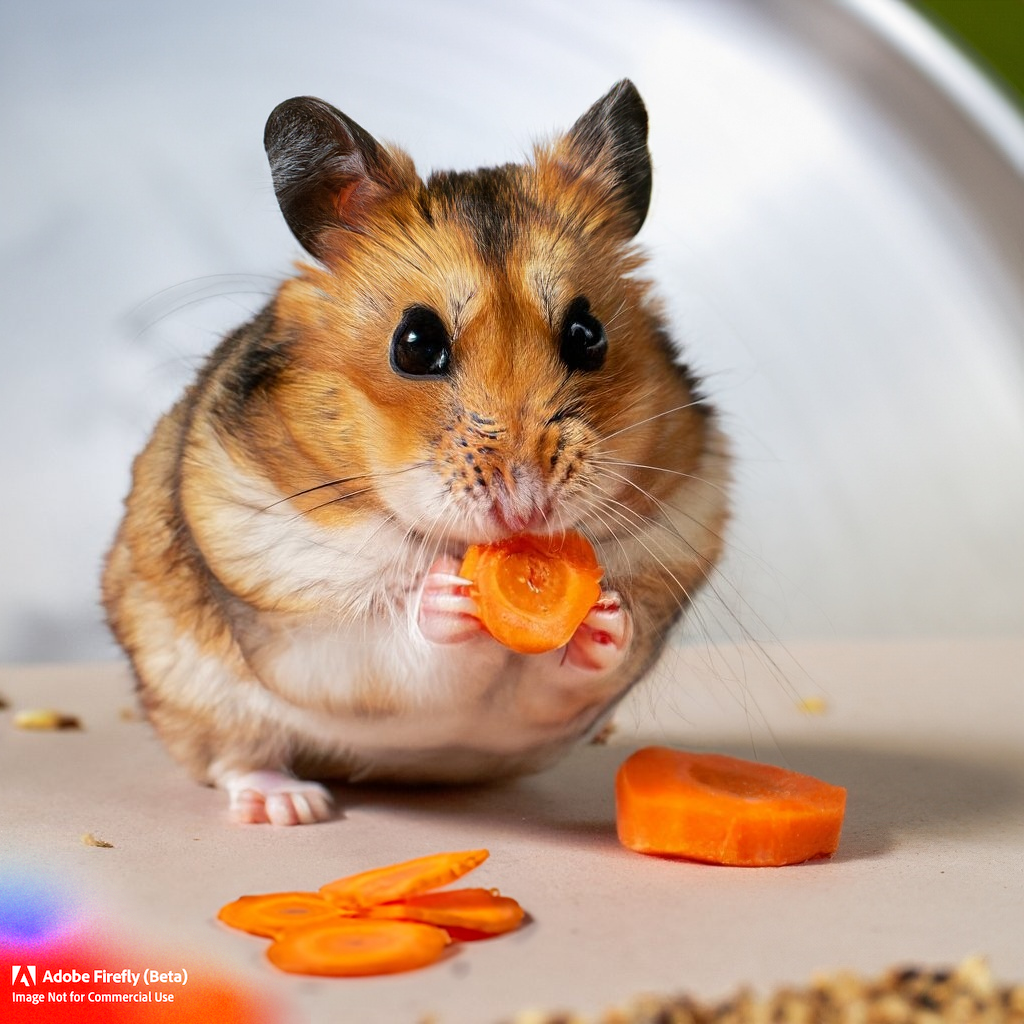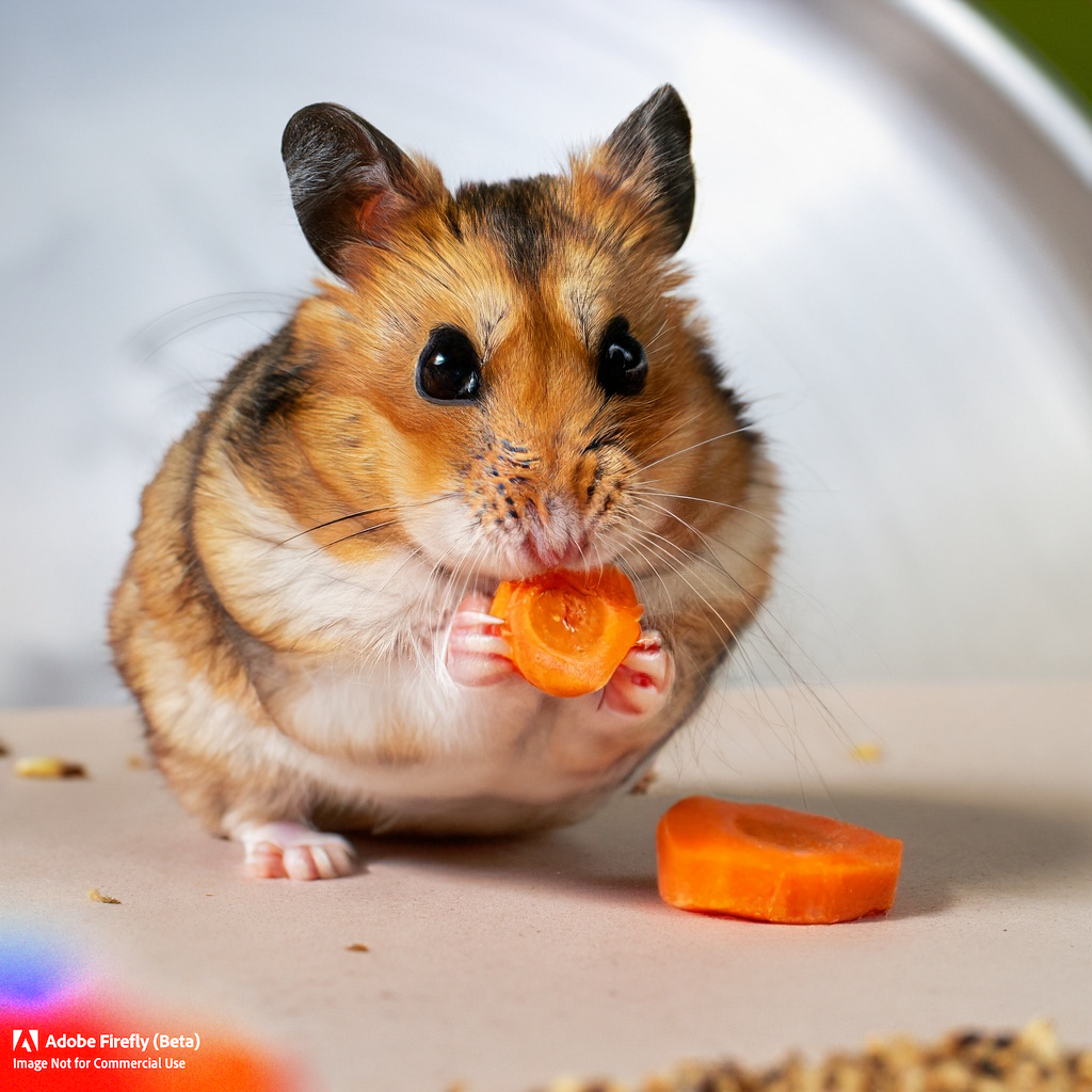 Image générée entièrement par Firefly, j'ai demandé un hamster qui mange une carotte.