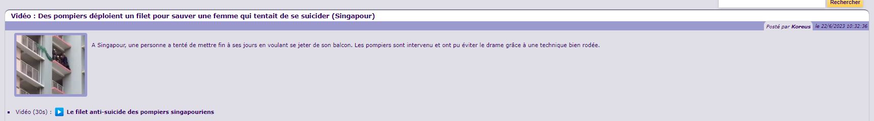 La vidéo est en article : Des pompiers déploient un filet pour sauver une femme qui tentait de se suicider (Singapour)