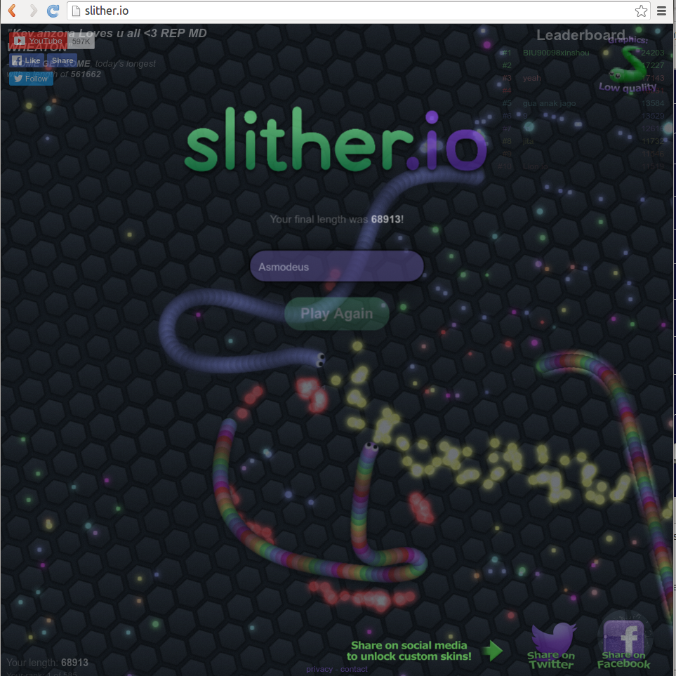 En fait , le jeu au début ne laggait presque pas mais ya des petits malins qui ont inventé une appli pour générer automatiquement des petits asticots qui te rentrent dedans sans attaquer...Donc tu grossis a vue d’œil en les mangeant sans danger...Plutôt marrant sauf qu' avec le bouche a oreille le nombre d'asticots a explosé sur les serveurs et maintenant plus moyen de jouer, les serveurs saturent...haha...