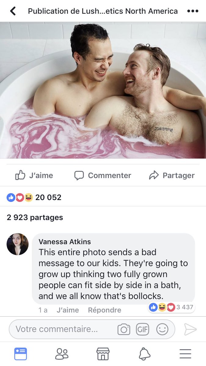 ![]() Traduction Citation : Cette image renvoie une mauvaise image à nos enfants. Ils vont grandir en pensant que deux personnes de taille normale peuvent rentrer et être côte à côte dans un bain, alors que nous savons tous très bien que ce sont des conneries !