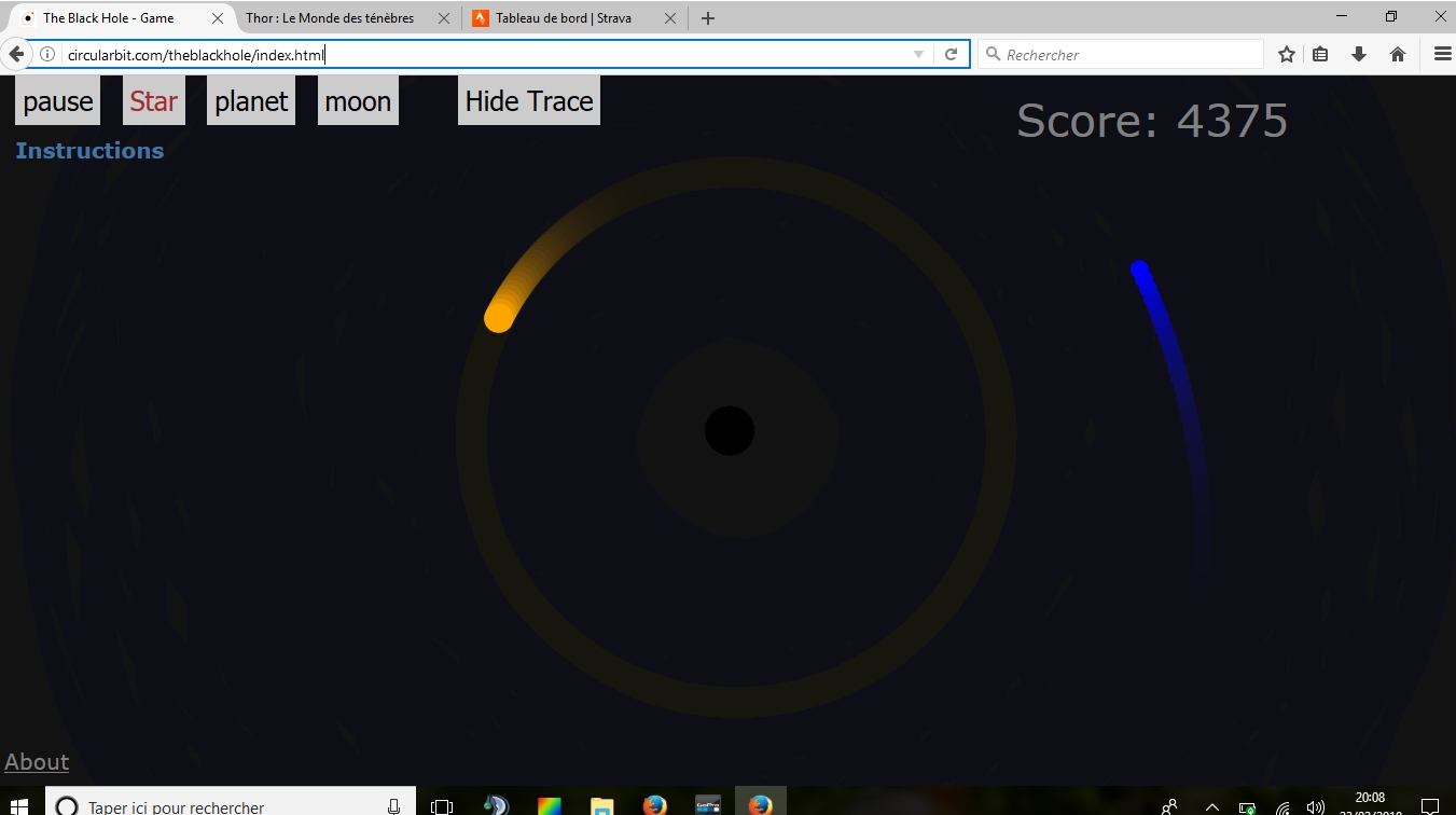 ![]() Au début elles frôlaient de temps en temps le trou noir du coup quelque sueur (on voit les trace sur le screen^^) mais plus le temps passe plus les soleil s'éloignent du trou noir, du coup il y a des chance que ça tienne longtemps ps: ah merde la planète que je croyais catapulté au loin est revenu et comme par hasard elle a touché un des soleil du coup 5821 pour le score (la planete allait tellement vite que sa trace n'était que des pointillés^^)