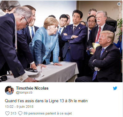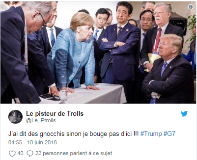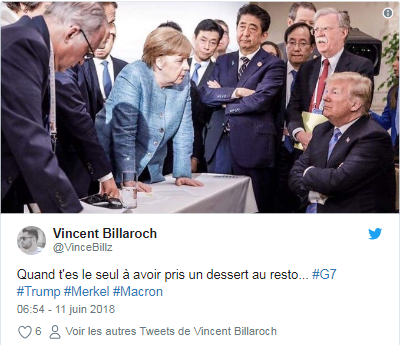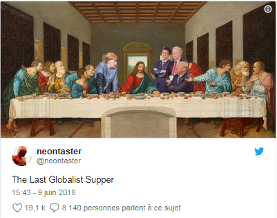 Prise par Jezco Denzel, photographe officiel du gouvernement allemand. Le style pictural peut rappeler le tableau "La Cène". ![]() Une tentative d'explication via konbini.com : Citation : our Philippe Moreau-Chevrolet, président de MCBG Conseil et professeur de communication à Sciences Po Paris, la viralité du cliché s’explique simplement par le fait que, "même si le G7 est très médiatisé, on n’y comprend rien". "Quand les mots échouent à décrire une situation, on a tendance à se tourner vers les images car elles semblent plus à même d’expliquer ce qui se passe"
