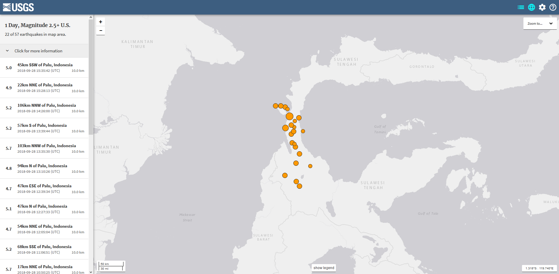 ![]() Powerful earthquake in Palu (Donggala, Sulawesi) triggered tsunami, Indonesia 28 september 2018 ils prennent cher en ce moment dans cette zone le plus petit rond sur cette carte c'est un 4.7 ... ![]()