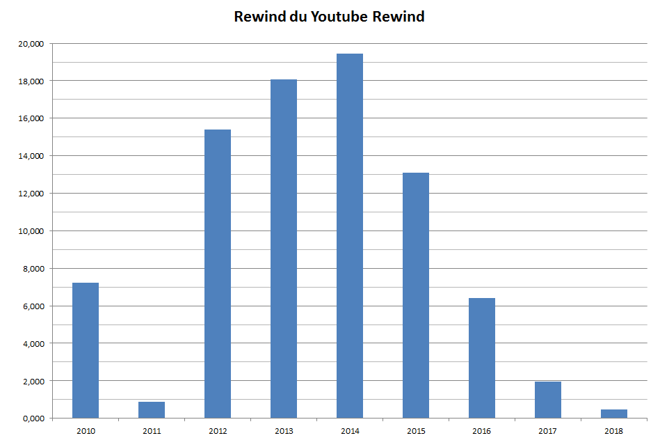 | J'aime glander ici    Inscrit: 16/09/2010 09:58 Post(s): 5345 Karma: 5152 | Mouai... je vais faire mon gros chiant mais je trouvais ça mieux avant... trop de Fortnite,... Y'a pas de Youtuber français si ? Si y'a un truc que j'ai bien aimé : la fin avec Primitive Technology  EDIT : @thazhok par curiosité j'ai été voir le ratio aime/aime pas, ça dégringole d'année en année ^^ et là comme de par hasard il est en tendance, alors que vu ce ratio de merde... bah ça devrait pas  EDIT 2 : Je me suis "amusé" à récupérer les données de chacun des rewind et tracé sur un magnifique graphique le ration aime/aime pas en fonction des années. Voici le graphique en question :  Alors que pouvons-nous dire sur ce graphique, et du coup de l'évolution de la popularité de ce Rewind ? Déjà on voit une magnifique progression jusqu'à une apogée en 2014. (Nous pouvons exclure l'anomalie de 2011 dont la raison a été clairement identifiée lorsque j'ai lancé la vidéo : La présence de Rebecca Black) à partir de 2014, par contre, c'est la dégringolade jusqu'à cette année où le ratio se retrouve inférieur à 1 (ce qui veut dire qu'il y a plus de personnes qui n'aiment pas par rapport à ceux qui aiment) En bref, avec cette tendance à la baisse depuis 2014, Youtube ne parvient pas pour le moment à retrouver la recette pour obtenir le même succès. A surveiller pour cette année, la vidéo étant très récente La fin d'une épopée ? d'un mythe ? L'avenir nous le dira. à l'année prochaine pour suivre la tendance suite au Rewind 2019 ! Putain je me fais chier au boulot cet aprem !