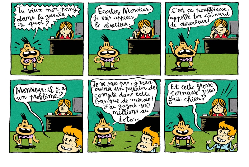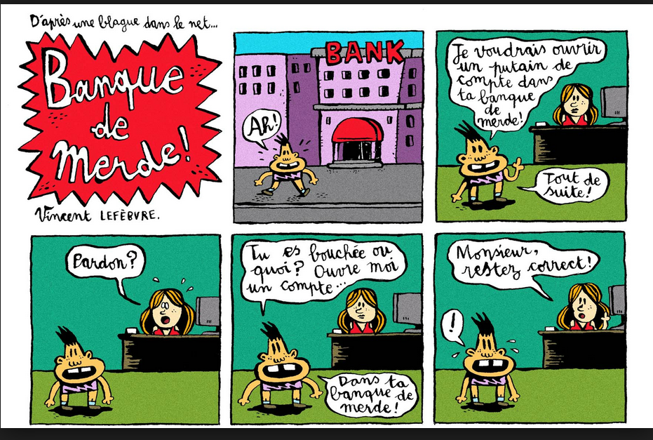 @goustaf Je pense qu'il manque la fin : comme le personnage continue à mal parler, la dame va chercher le directeur de la banque qui demande "Monsieur, je vous demande de rester poli, que puis-je pour vous ?", le personnage est à nouveau insultant "J'ai dis que je venais déposer un million de dollars dans votre banque de merde" et le directeur répond "Et cette connasse vous emmerde ?"