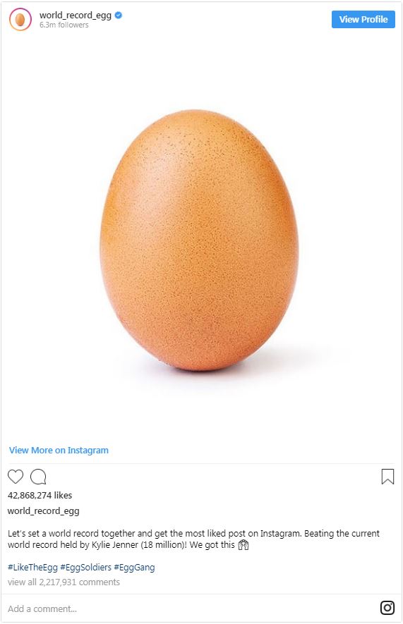 Sur Instagram, une personne (un anglais semblerait-il) a lancé le 4 janviers le défit de faire le plus de like pour cette image d'un oeuf.